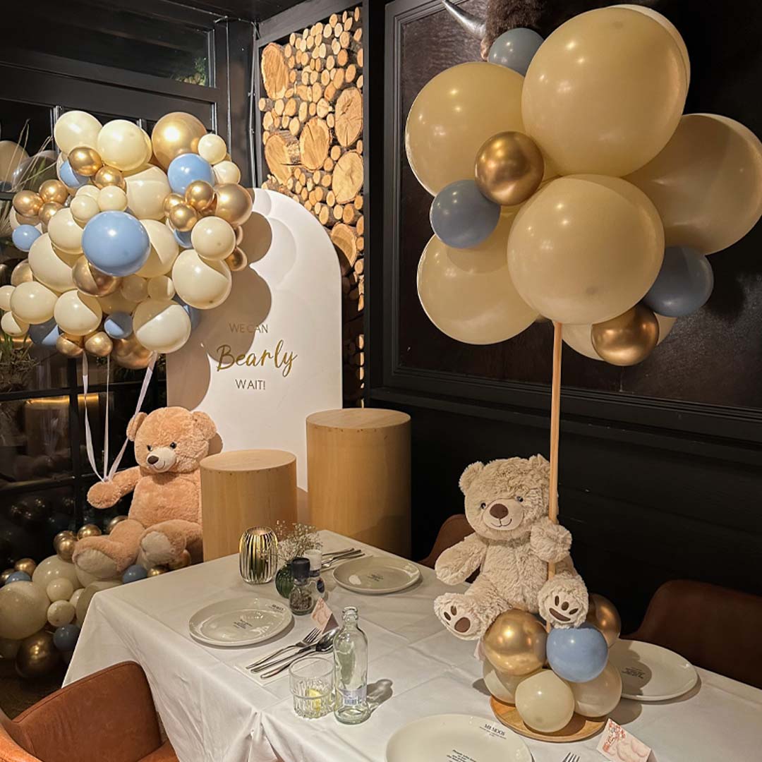 Vier de komst van je kleintje in stijl met het schattige Bearly Babyshower thema, aangevuld met een vleugje blauw of roze! Denk aan zachte aardetinten zoals zand, crème en goud, gecombineerd met een schattige teddybeer. Voeg een subtiel accent van babyblauw of pastelroze toe voor de perfecte balans tussen boho-stijl en een gender-specifiek tintje. Een indrukwekkende ballonnenboog, een sfeervol gedekte tafel en een gezellige photobooth maken de babyshower compleet. Laat je inspireren door onze voorbeelden en vraag direct jouw unieke Bearly Babyshower decoratie aan!
